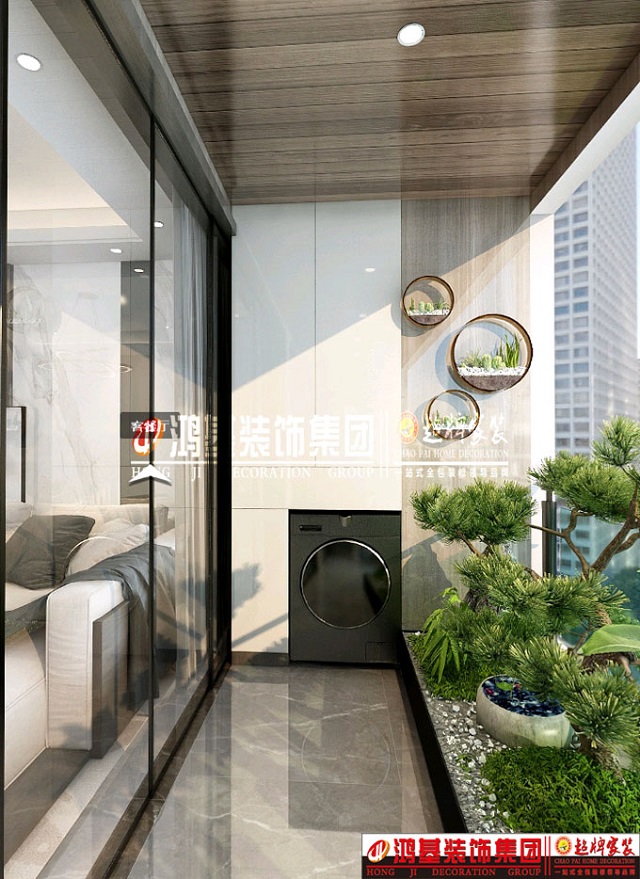 圖4.亮點(diǎn):陽臺(tái)西側(cè)滾筒洗衣機(jī)和儲(chǔ)物柜的結(jié)合設(shè)計(jì),充分利用空間。衛(wèi)生打掃更加方便,不留死角。 東側(cè)留有更多的空間可以培養(yǎng)綠植及休閑,給陽臺(tái)空間增添生機(jī)。