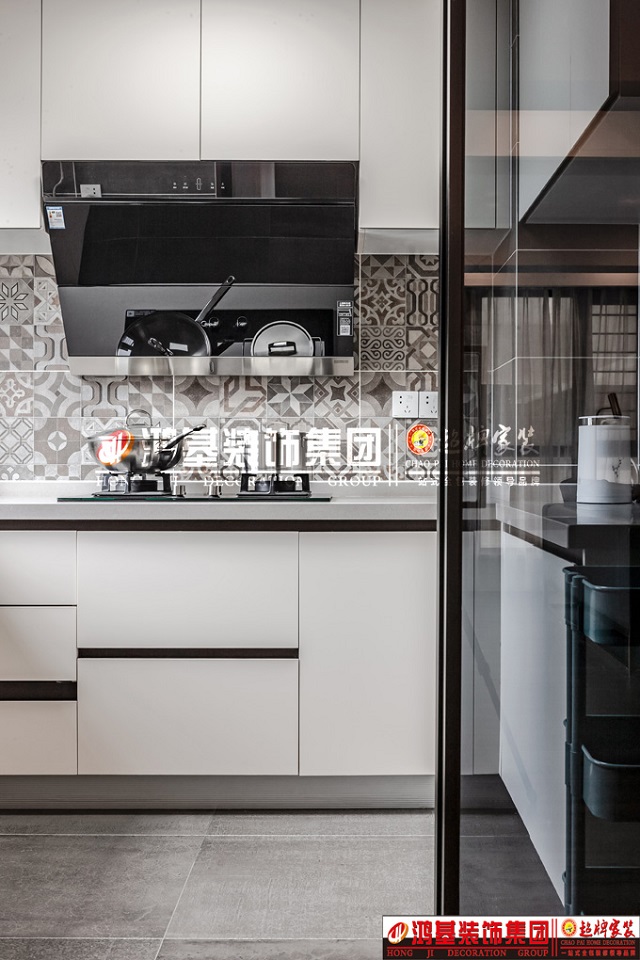 圖8.亮點(diǎn):廚房采用當(dāng)下流行的極窄推拉門透明玻璃的設(shè)計(jì),墻面采用花磚設(shè)計(jì),拒絕平庸,使整個(gè)空間充滿時(shí)尚感。